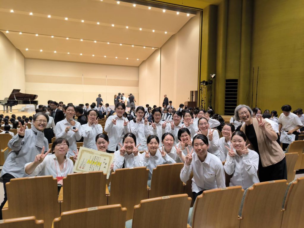 9月13日(土)愛知県稲沢市名古屋文理大学文化フォーラムで行われたNHK全国学校音楽コンクール東海北陸ブロックコンクールにおいて、仁愛コーラス部は第3位にあたる銅賞を受賞しました。40人上限で出場している各県の精鋭たちに対し、17人という少人数で入賞を果たすのは極めて異例の快挙です。演奏後は、他県の生徒さんたちが「素敵でした!」と駆け寄って声をかけてくれるうれしい驚きの場面もありました。