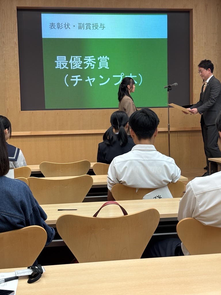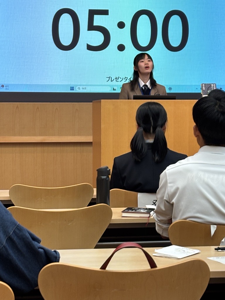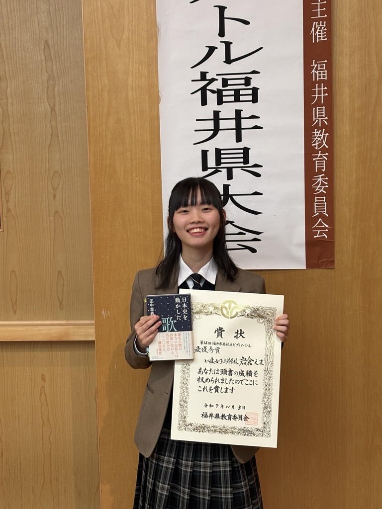 第12回福井県高校生ビブリオバトル 全国高等学校ビブリオバトル福井県予選会(11/3(月))において本校1年の岩倉えまさんが、予選を勝ちあがり、決勝で、見事、最優秀賞(チャンプ本)に輝きました。岩倉さんは、「日本史を動かした歌」(田中章義著)を紹介しました。この本は、歴史上の偉人が詠んだ歌から、教科書で学んでいる偉人の素顔を知ることができ、歴史が好きな人はもちろん、歴史が好きでない人にも是非読んでほしいと語りかけました。なお、岩倉さんは、2026年2月8日に港区のTAKANAWA GATEWAY CITYで開かれる「第12回全国高校ビブリオバトル」に福井県代表として出場します。全国大会での活躍を期待します。