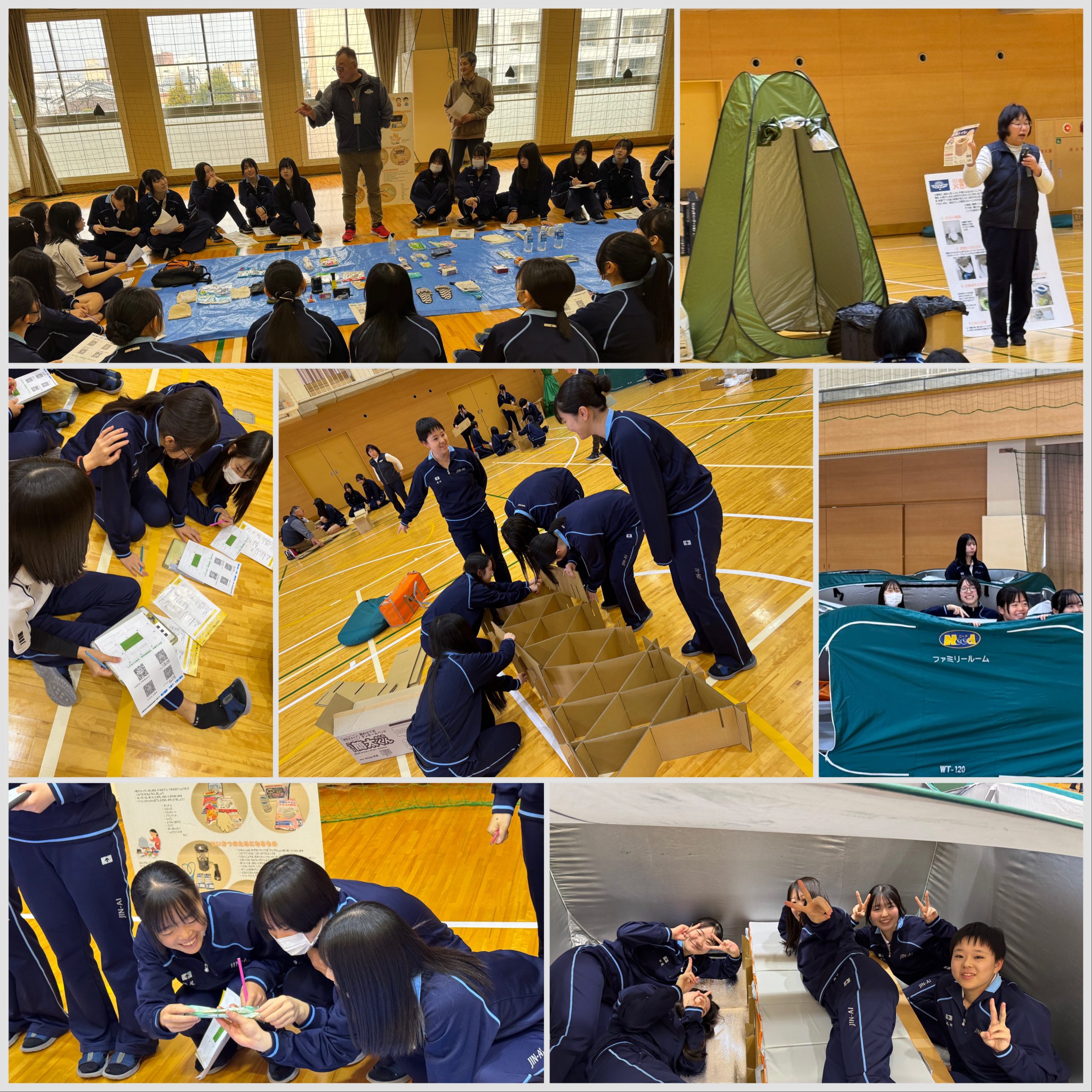 まず、災害の映像をみながら、自分の命を守る行動のための知識や逃げる時の心構え、避難行動のタイミングなどについて講話をいただきました。その後、避難所生活の注意点や困りごとなどを知り、避難所設営の体験をしました。