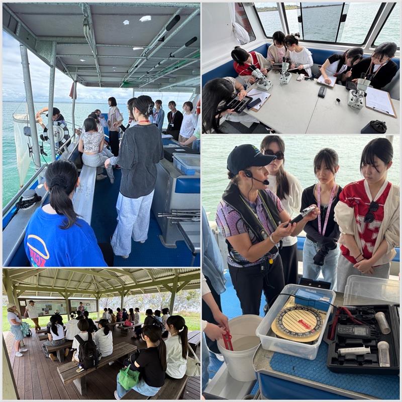 今日はエクスカージョンとしてモートン湾の環境教育センターへ出かけました。モートン湾から環境調査船にのって沖合いのセントヘレナ島へ向かう途中で船を停止させ、移動の途中にプランクトンネットで集めた微生物を実体顕微鏡で観察し、どんな生物が含まれているかを調べました。そのあと再び船を走らせ、セントヘレナ島に上陸しました。かつては刑務所の島として利用されていましたが、現在は国立公園に指定されている無人島です。昼食をとり、ビーチからブリスベンシティを臨んだあと、帰りの船内では、くるときに仕掛けておいた水中カメラの映像で、餌に群がる魚や、その魚を狙ってやってくるサメの様子を観察しました。